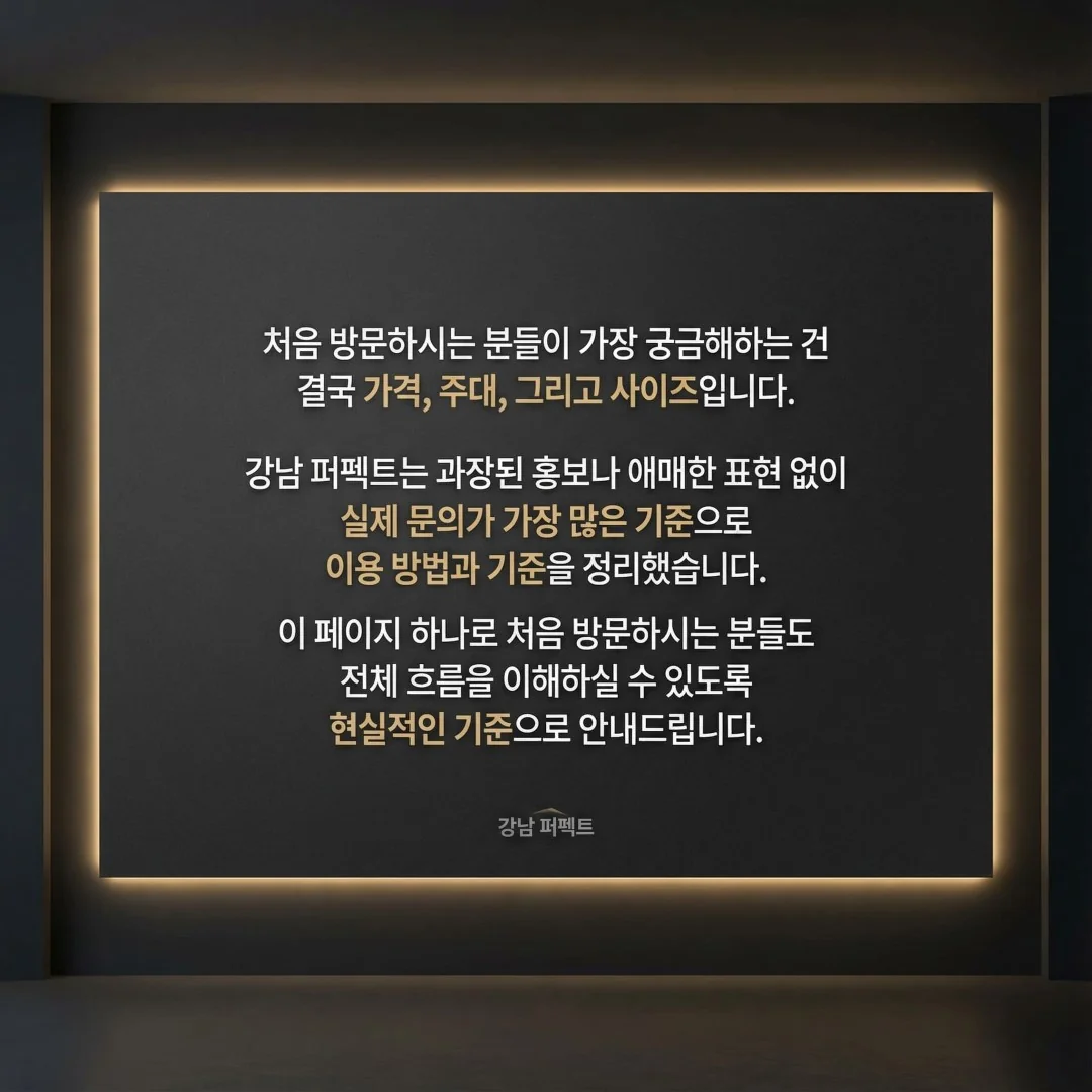 강남 퍼펙트는 강남역 도보 5분 거리에 위치한 70여 개 룸 규모의 대형 업장입니다. 가격, 주대, 초이스 시스템을 투명하게 안내합니다.